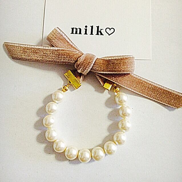 キスカパールとピンクベージュのベルベットリボンのブレスレットです♡